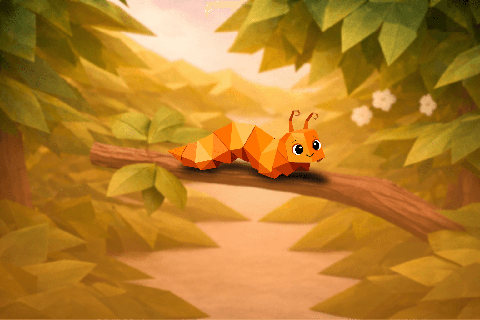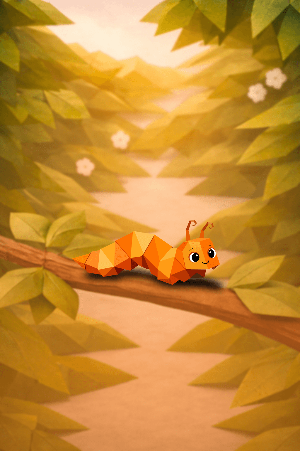 The caterpillar represents transformation that begins long before it is visible, while orange marks the first light of dawn between an ending and a beginning.